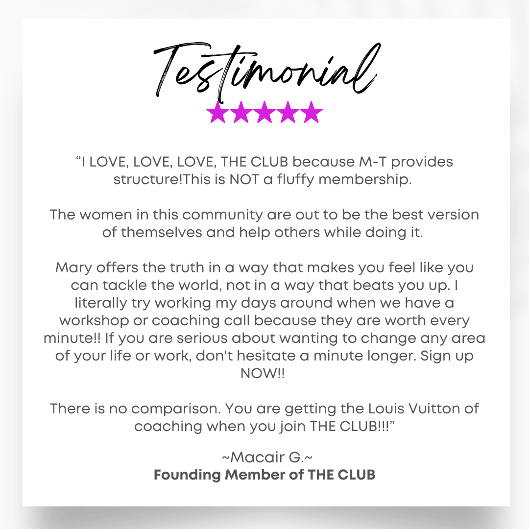 Call me Mary or M-T, and know this: I created THE CLUB because I know what it takes to break through limits- again and again.